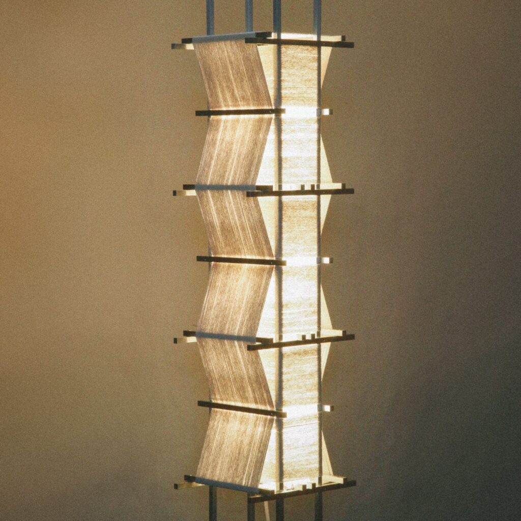 Rooted in the idea of weaving as an early form of architecture, Tuppen’s Aluminium and Sapele lamps reimagine the structure of a scale model—string defining form, light emanating like a hearth.