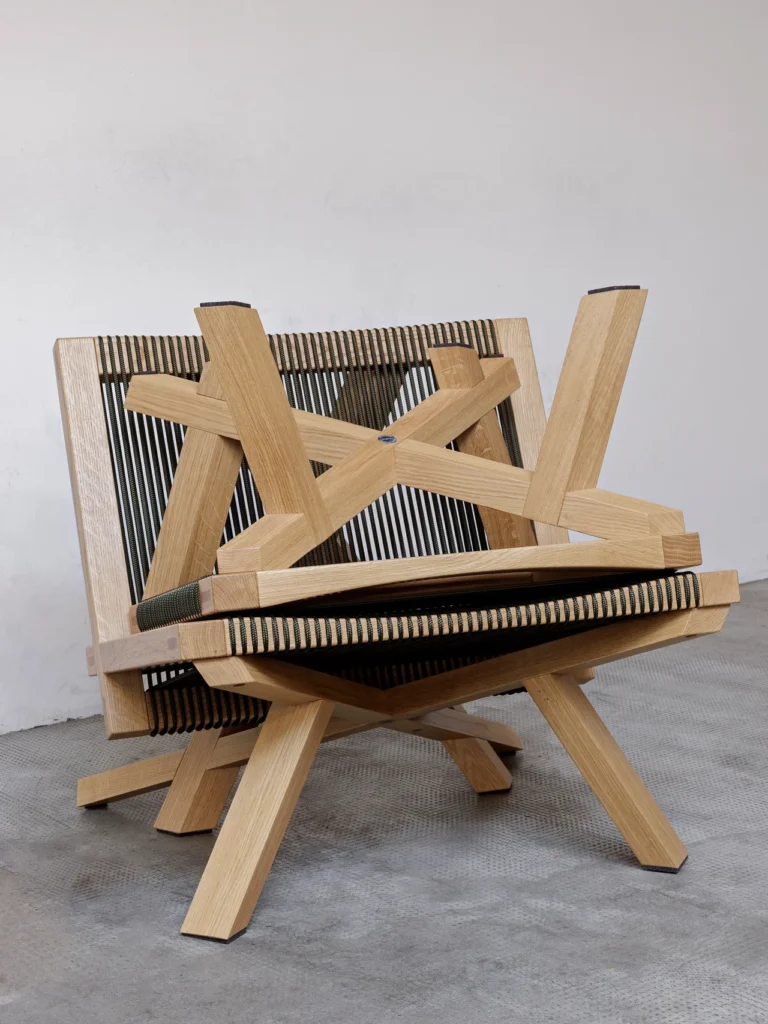 DiscoverThe Volkshaus furniture series was designed for the institution Volkshaus Basel in 2020, as part of their boutique hotel. Characterised by a clear, sculptural appearance, the intersecting X-shapes reveal a complex frame construction – a product of research and exploration into the possibilities and limitations of CNC precision cutting for traditional wooden joints, like those used in Japanese carpentry and architecture.